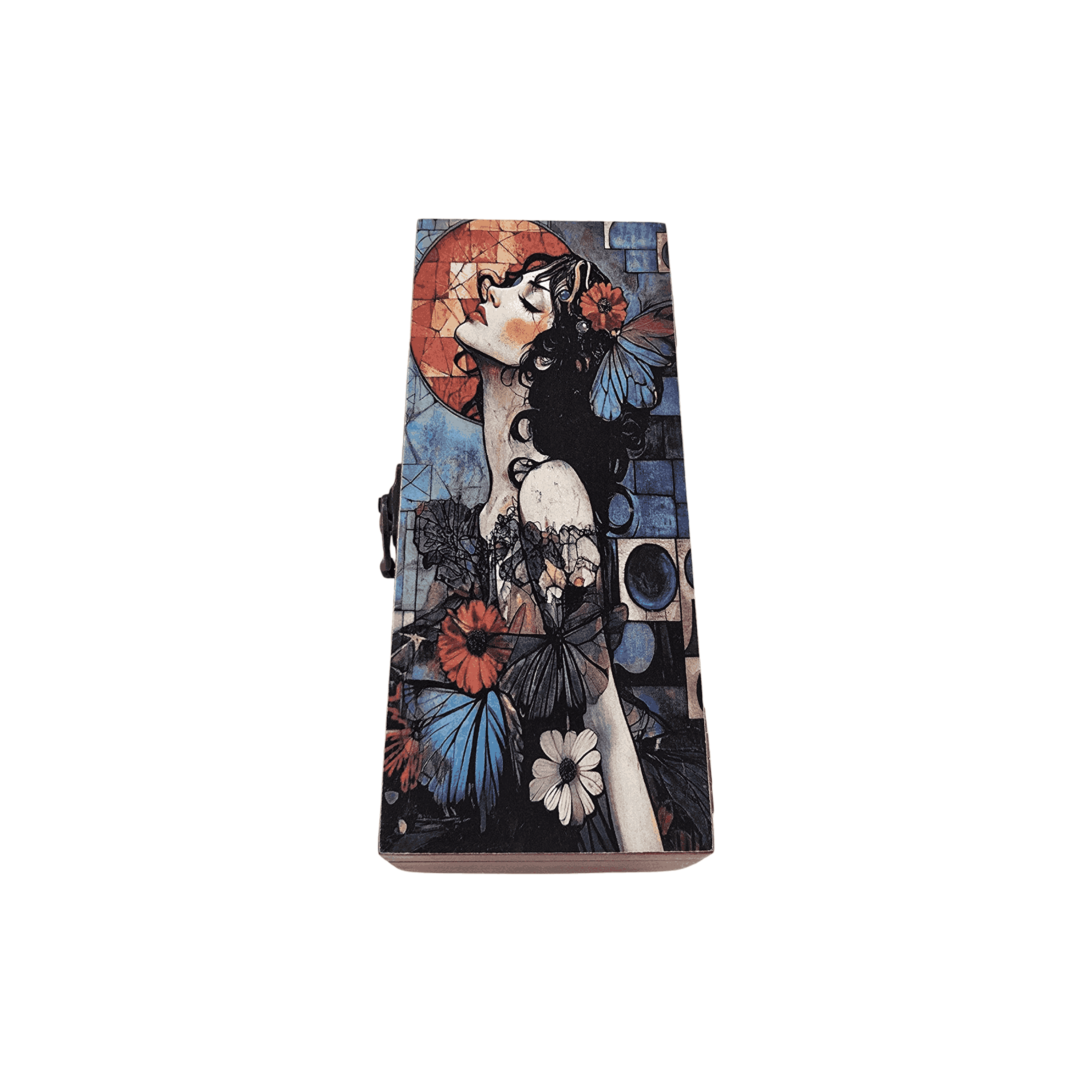 این جاعینکی با طراحی خیرهکننده و رنگهای زنده، فراتر از یک وسیله کاربردی، یک اکسسوری هنری تمامعیار است. طرح روی درب جعبه با الهام از سبکهای هنری مدرن، چهرهای غرق در گل و پروانه را به تصویر کشیده که نمادی از رهایی و رویاپردازی است.